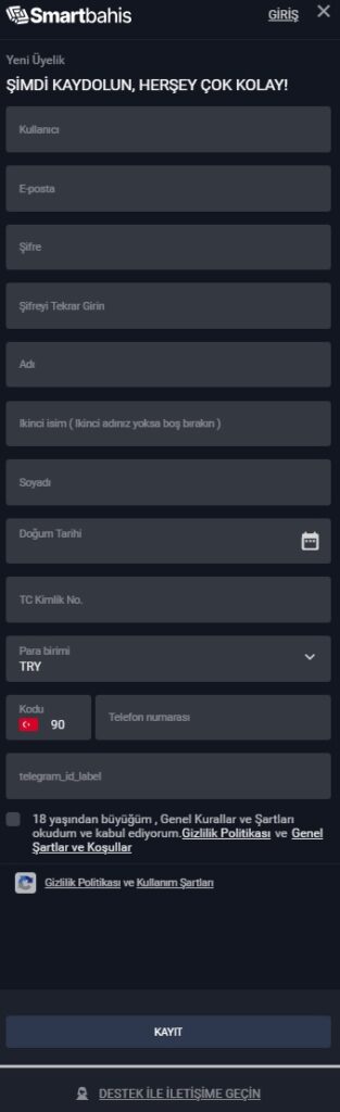 Smartbahis kayıt formunu doldururken sizlerden istenen bilgileri eksiksiz olarak veriniz. Eksik veya yanlış olarak verdiğiniz bilgileri sonrasında düzeltmeniz mümkün olmayabilir. Öyle ki bu durum para çekmenize engel oluşturabilir. Şu anda sıralamak istemediğim için kayıt formunun bir görselini burada paylaşacağım. İnceleyerek sizlerden hangi bilgilerin istendiğini görebilirsiniz.