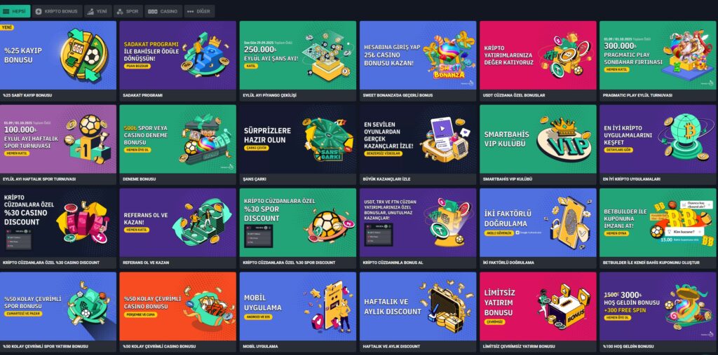 Fazla avantajlı olmayan ve birbirini tekrarlayan bazı bonusları bu listenin dışında tuttum. Siz eğer listenin tümünü görmek isterseniz Smartbahis promosyonlar sayfasını ziyaret edebilirsiniz.